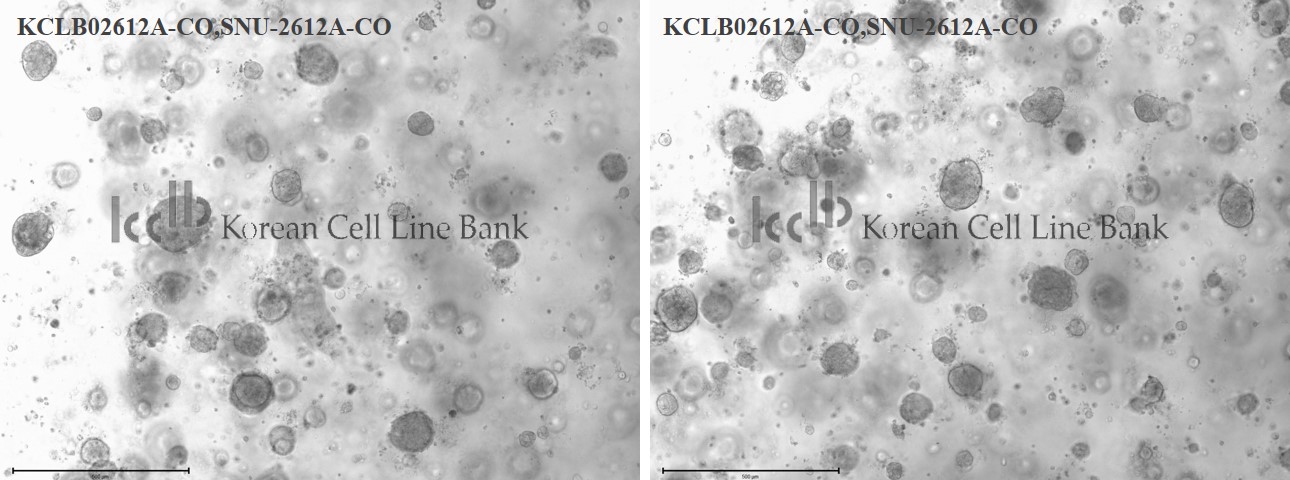 The organoid-containing dome (Corning, Matrigel; Trevigen, Cultrex BME; Merck, ECM; Thermofisher, Geltrex) was mechanically pipetted using animal origin-free, recombinant enzyme (Thermofisher사 TrypLE Express solution..) and organoids were collected in a 15 mL conical tube. The organoid-containing dome was mechanically dissociated with intense pipetting, and the tube containing the organoids and organoid-containing dome mixture was incubated at 37°C for approximately 5 - 10 min. The organoids were centrifuged at 1,000 rpm for 3 min, and the supernatant was aspirated. Once organoid-containing dome was removed, the cell pellet was resuspended with fresh organoid-containing dome, seeded in a T-25 flask and the flask was incubated at 37℃ for 10 min. Once organoid-containing dome was solidified, 5 mL of the culture medium was added to the flask to overlay the organoid-containing dome and cells were incubated in a 37℃ and 5% CO2 culture incubator.