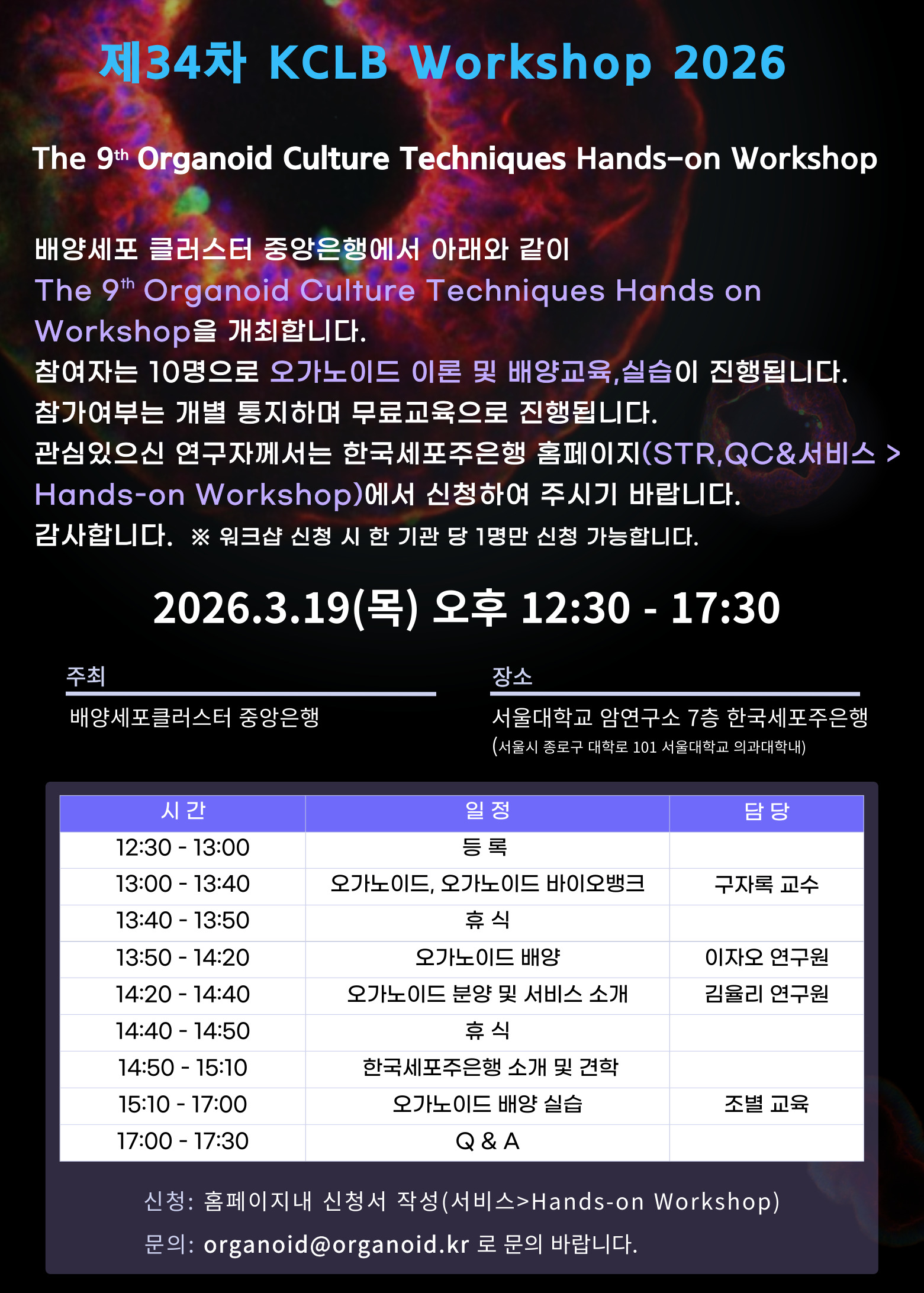 제34차 KCLB Workshop 2026, The 9th Organoid Culture Techniques Hands-on Workshop